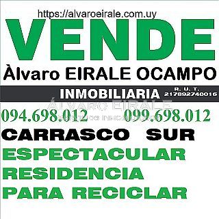 2025. CARRASCO SUR: J. B. ALBERDI y CORCEGA. CASA para RECICLAR con FRENTE X 2 CALLES. IDEAL PARA EMPRESA, COLEGIO, CLINICA, RESIDENCIAL. TERRENO 15.00 X 71.00= 1.060 m2 GARAGE con CAPACIDAD PARA 6 AUTOS. REJA PERIMETRAL. DISPOCION CASA FRONTAL: LIVING COMEDOR con HOGAR, 4 DORMITORIOS, ESCRITORIO, BAÑO SOCIAL, 2 BAÑOS COMPLETOS, COCINA con ESTAR y ESTUFA LEÑA. BARBACOA TECHADA con PARRILLERO. PATIO y FONDO LIBRE con PISCINA. TODA LA EDIFICACION ES CON TECHO DE PLANCHADA. SE ACEPTA PERMUTA ò FINANCIACION.*VENDE INMOBILIARIA: Àlvaro EIRALE OCAMPO 099.698.012 y 094.698.012 alvaroeirale@gmail.com https://ALVAROEIRALE.COM.UY Servicios Inmobiliarios en Uruguay desde 1986. Comisiòn Inmobiliaria 3 % + IVA RUT217892740016